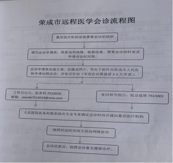 由荣成市人民医院负责远程会诊的实际工作。每季度安排各医院远程会诊的时间,各医院尽量在规定的时间内完成远程会诊。各医院有专门的联络员,首先在远程智慧荣成/智慧医疗平台中,进入远程会诊系统填写申请单,由荣成市人民医院联系本院专家并确定会诊时间。如果有急会诊,首先在远程智慧荣成/智慧医疗平台中,进入远程会诊系统填写申请单,并在(荣成)慢病远程医学会诊联络群通知荣成市人民医院相关管理人员,由他来联系本院专家给予会诊。会诊时留影像等记录。会诊为免费。